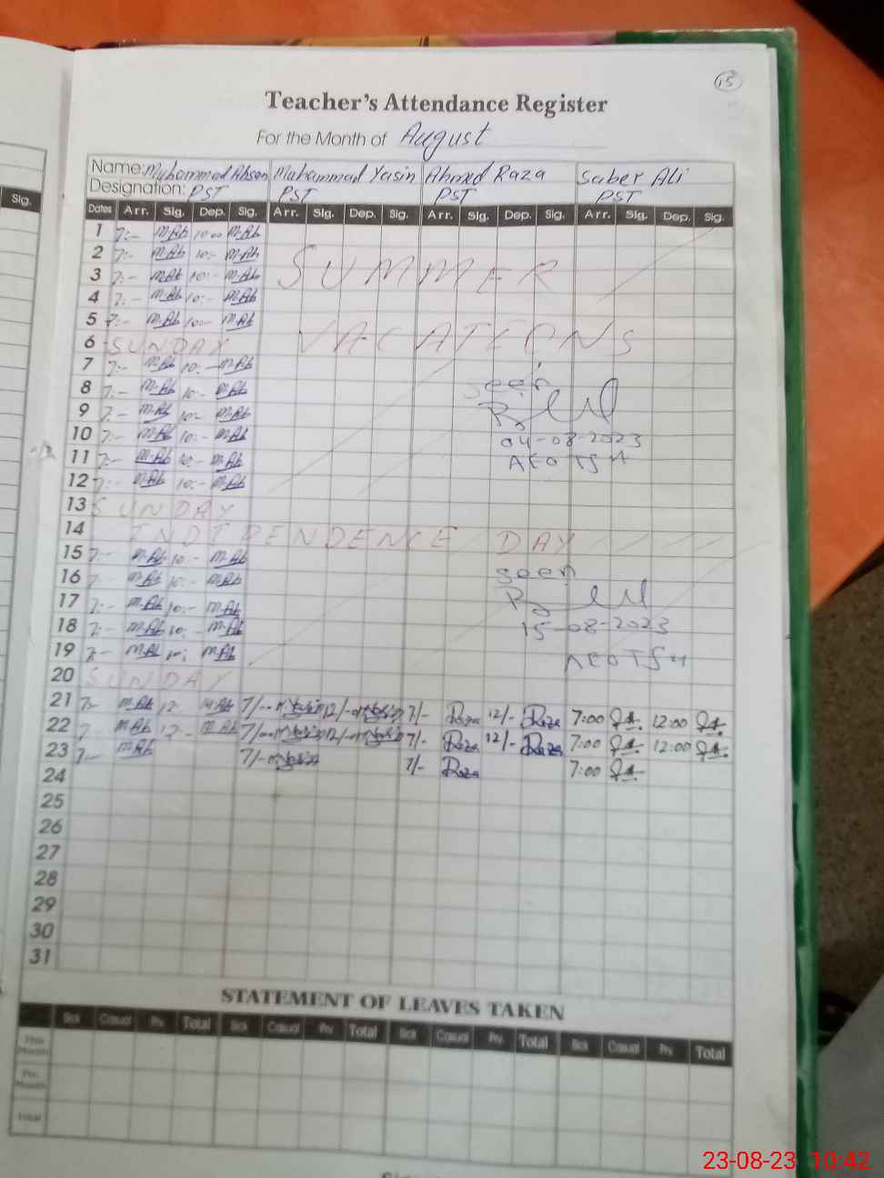 | Remarks (Use Separate Page if Required): Teacher Mr Tariq Hanif newly posted to this school and yet not added to SIS System | |||||
