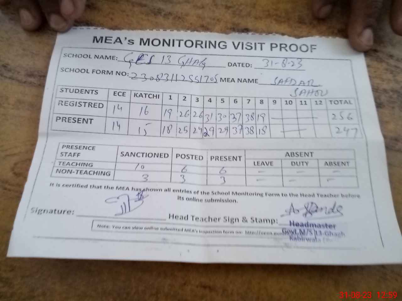 | Attendance Register | Head Teacher | MEA with School | Visit Proof |
