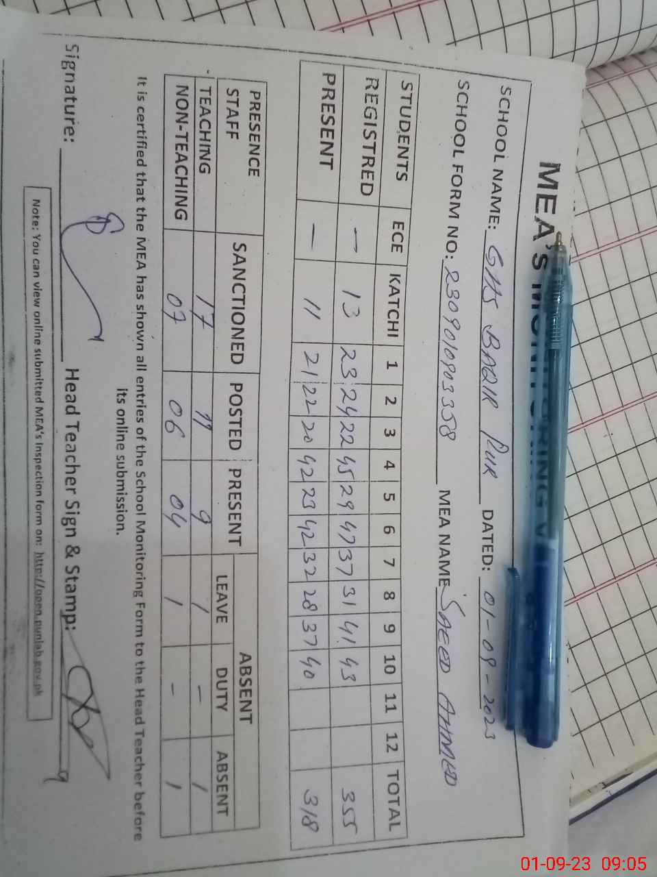 | Attendance Register | Head Teacher | MEA with School | Visit Proof |