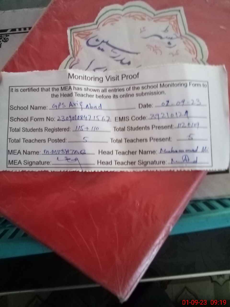 | Attendance Register | Head Teacher | MEA with School | Visit Proof |