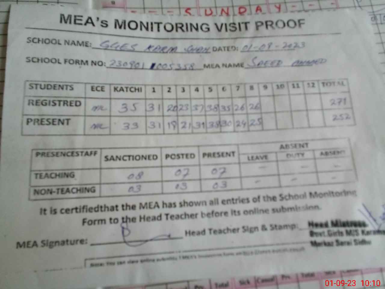 | Attendance Register | Head Teacher | MEA with School | Visit Proof |