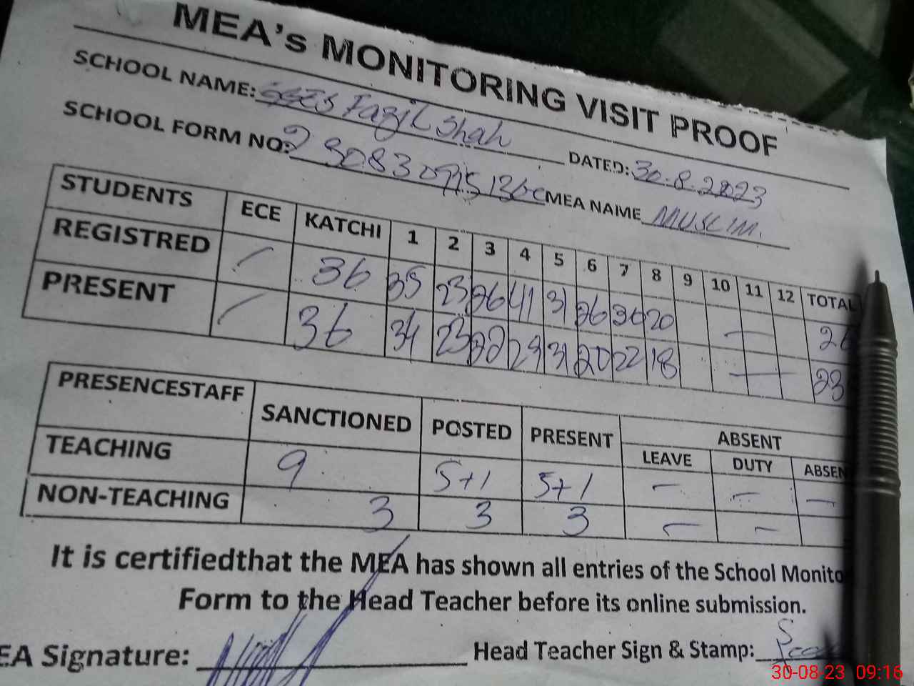| Attendance Register | Head Teacher | MEA with School | Visit Proof |