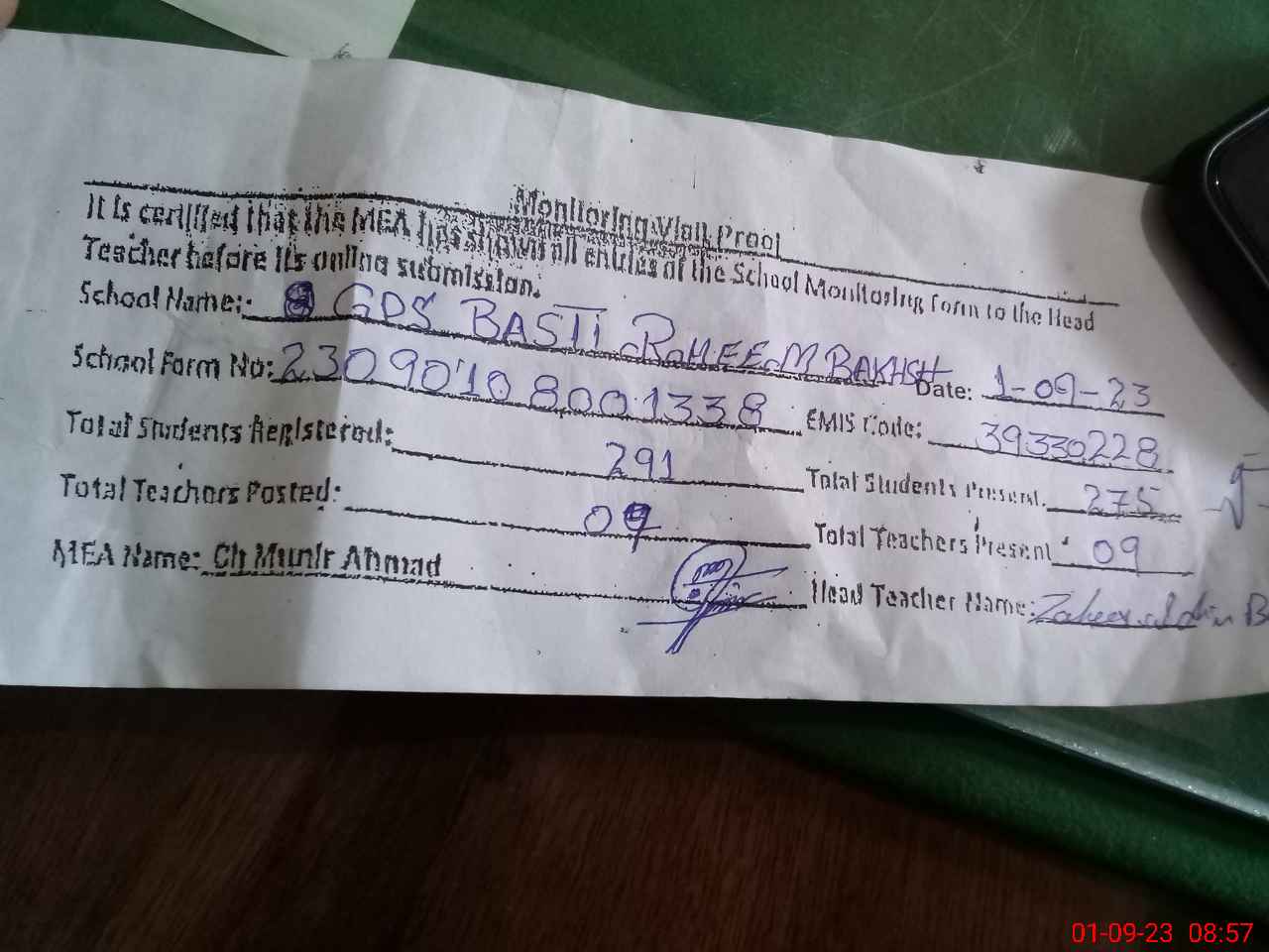 | Attendance Register | Head Teacher | MEA with School | Visit Proof |