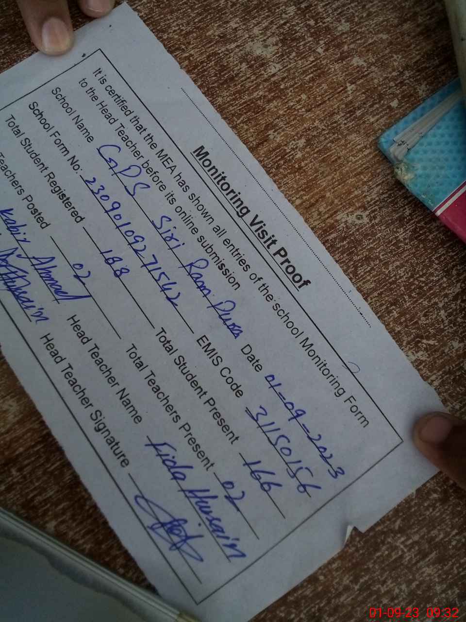 | Attendance Register | Head Teacher | MEA with School | Visit Proof |