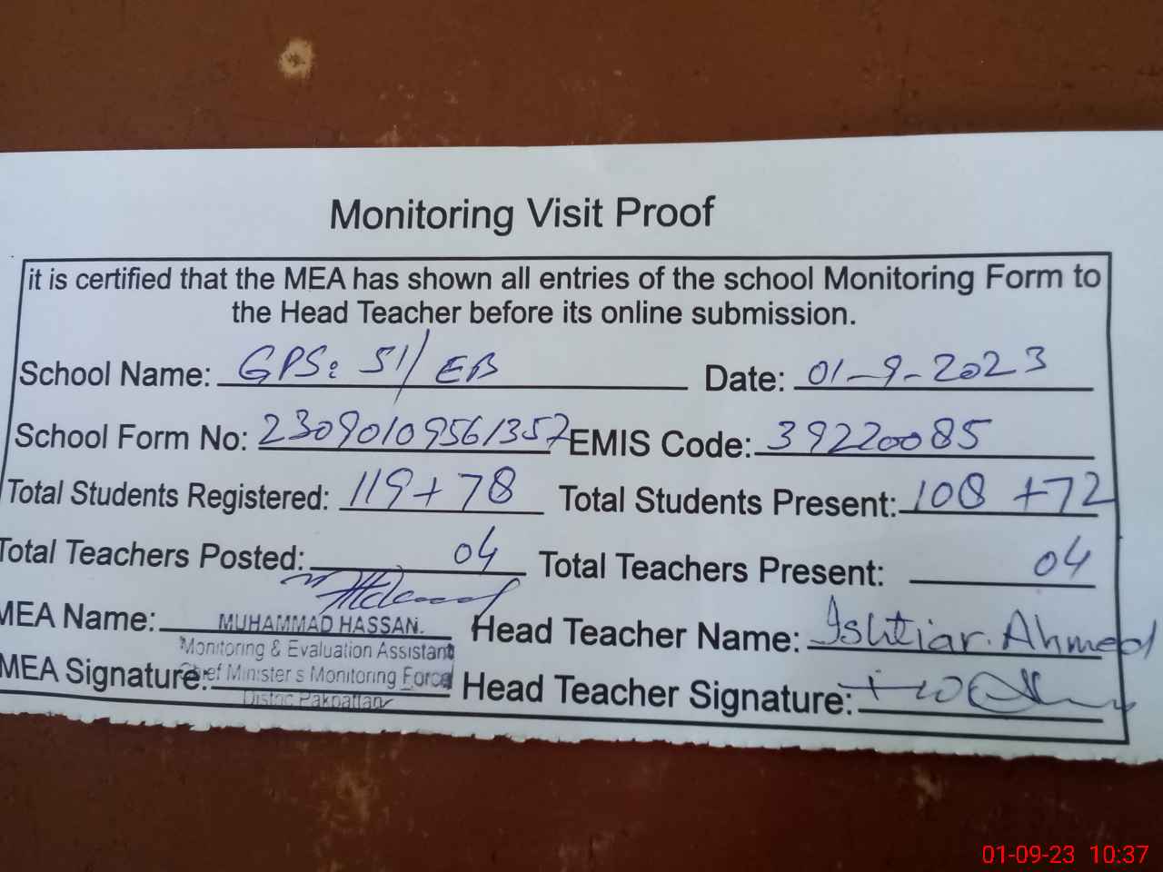 | Attendance Register | Head Teacher | MEA with School | Visit Proof |