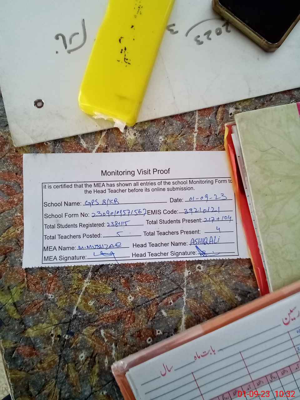 | Attendance Register | Head Teacher | MEA with School | Visit Proof |