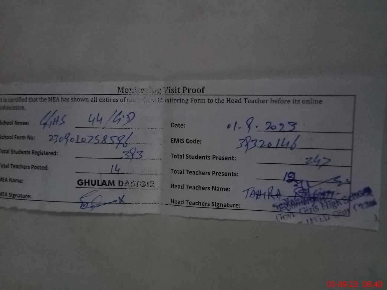| EMIS Code: 39320146 | Name of School: GGHS CHAK NO. 44/G.D | |||