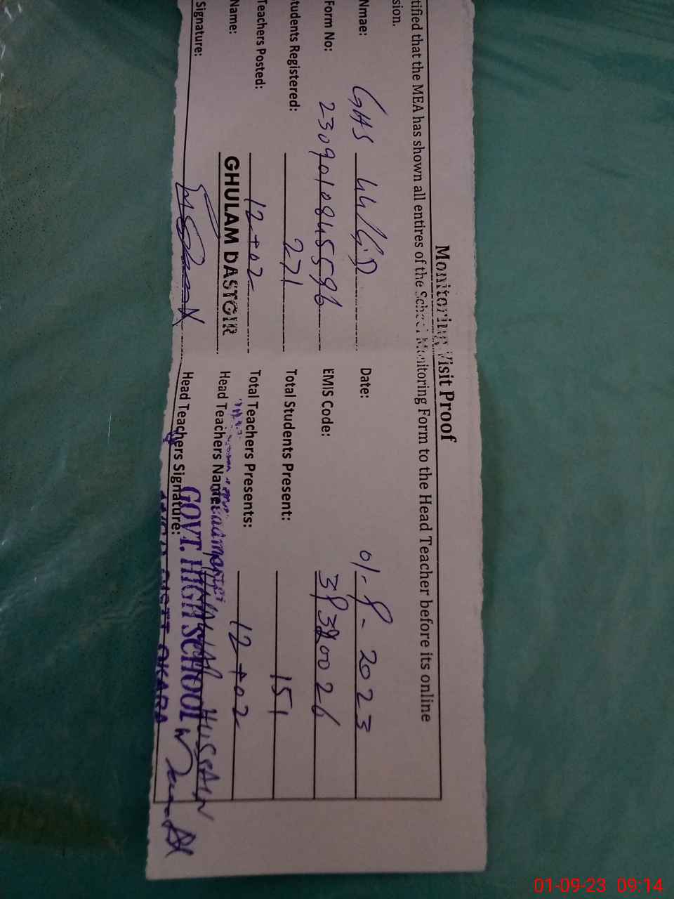 | Name: Ah**** Na**** Kh**** Designation: (School Headmaster's/Headmistress's) HM Phone/Cell Number: 03**** |
