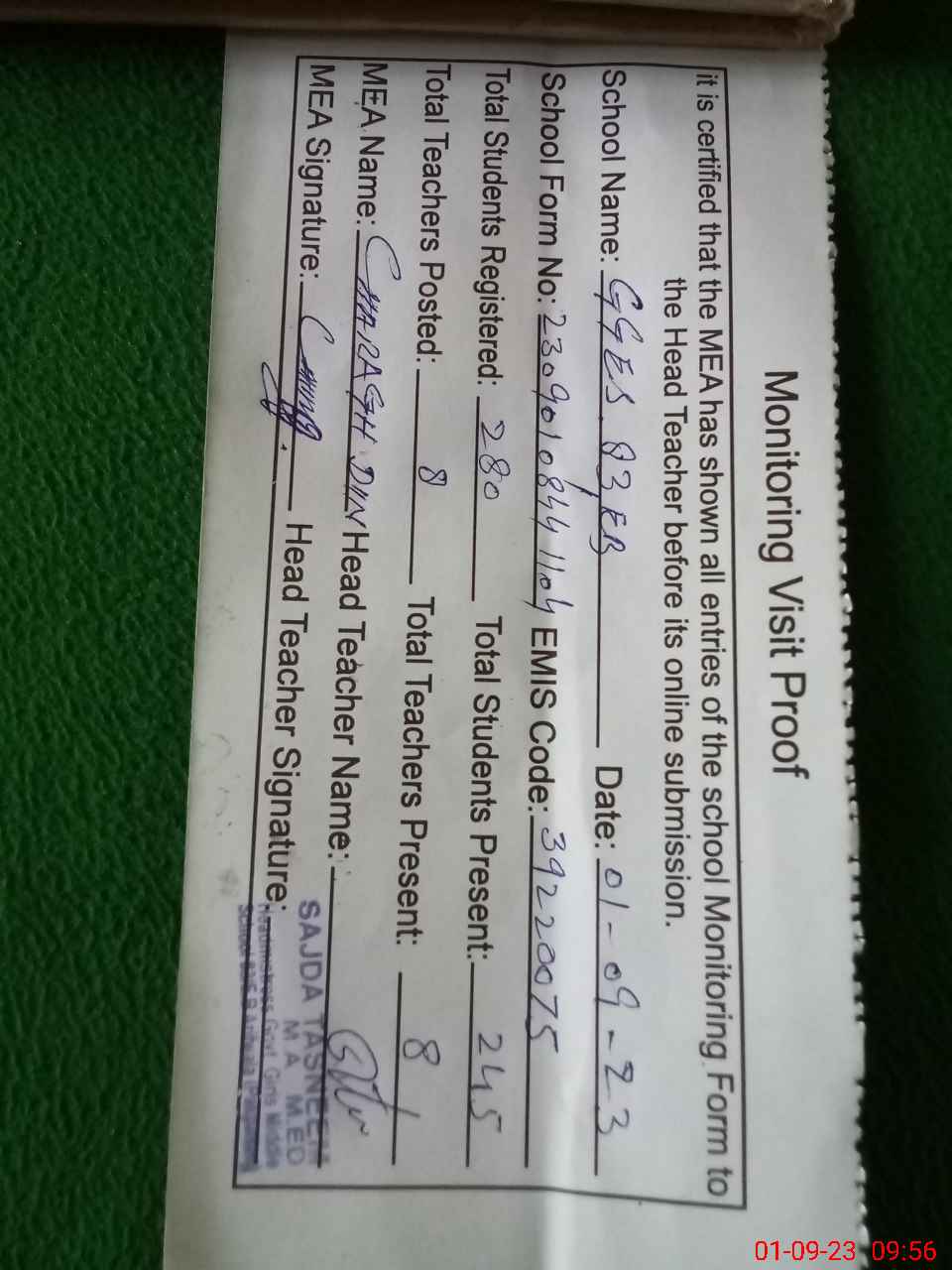 | Certified that this School was Inspected by the Undersigned MEA/DMO Today and the Information Stated Above is as Per Record. | |||||