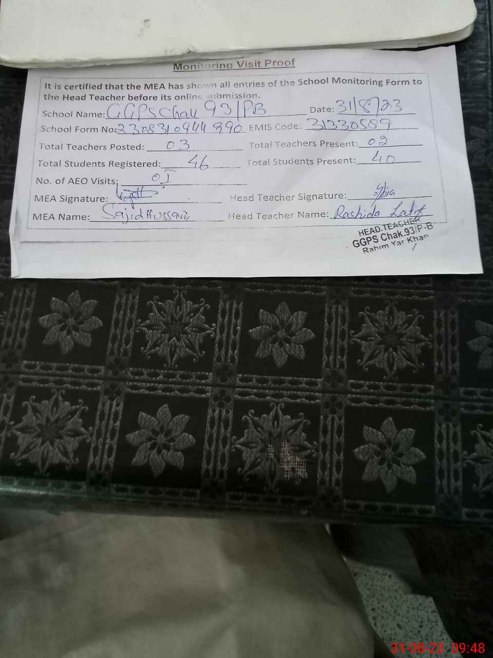 | Attendance Register | Head Teacher | MEA with School | Visit Proof |