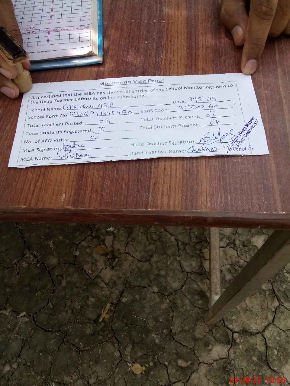 | Attendance Register | Head Teacher | MEA with School | Visit Proof |