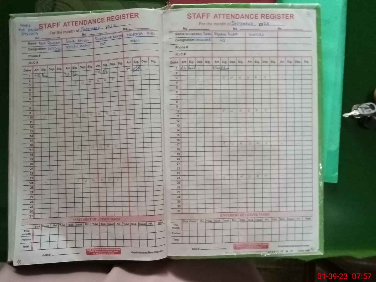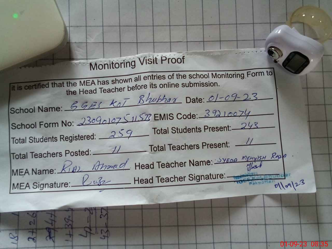 | Attendance Register | Head Teacher | MEA with School | Visit Proof |