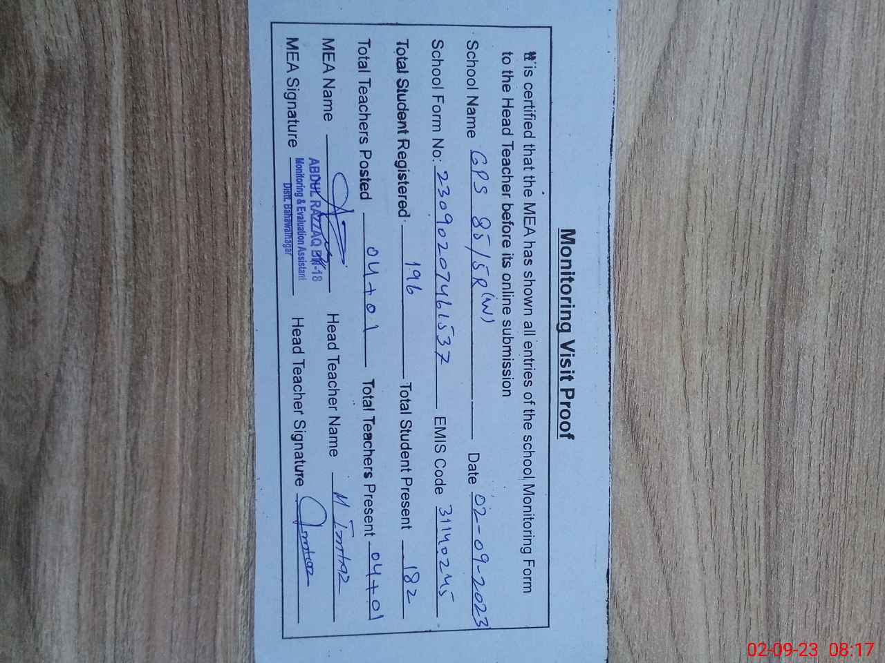 | EMIS Code: 31140245 | Name of School: GPS CHAK NO 85/5-R (W) | |||