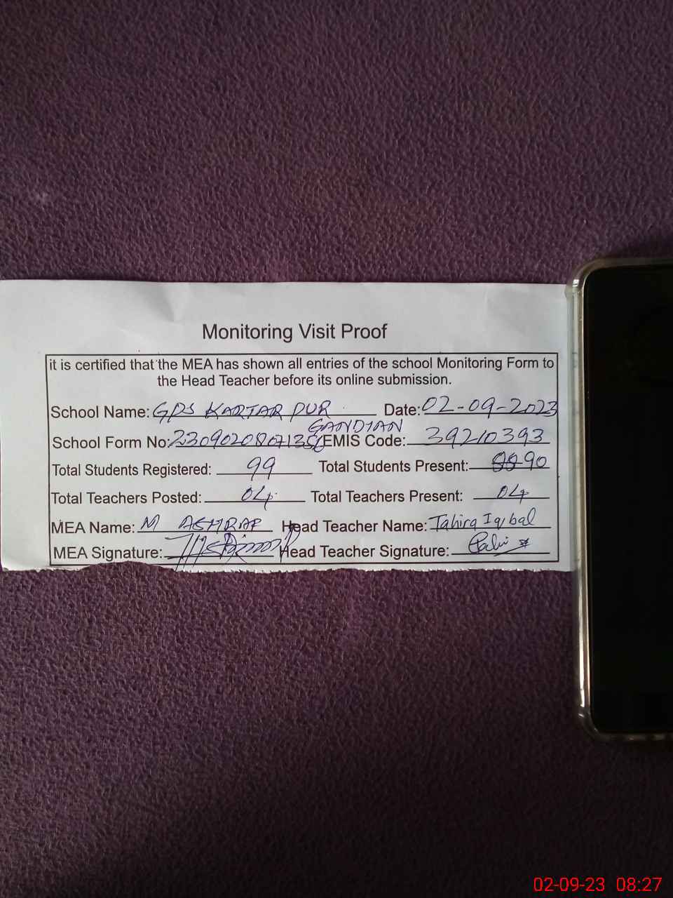 | EMIS Code: 39210393 | Name of School: GGPS KARTAR PUR GANDIAN | |||