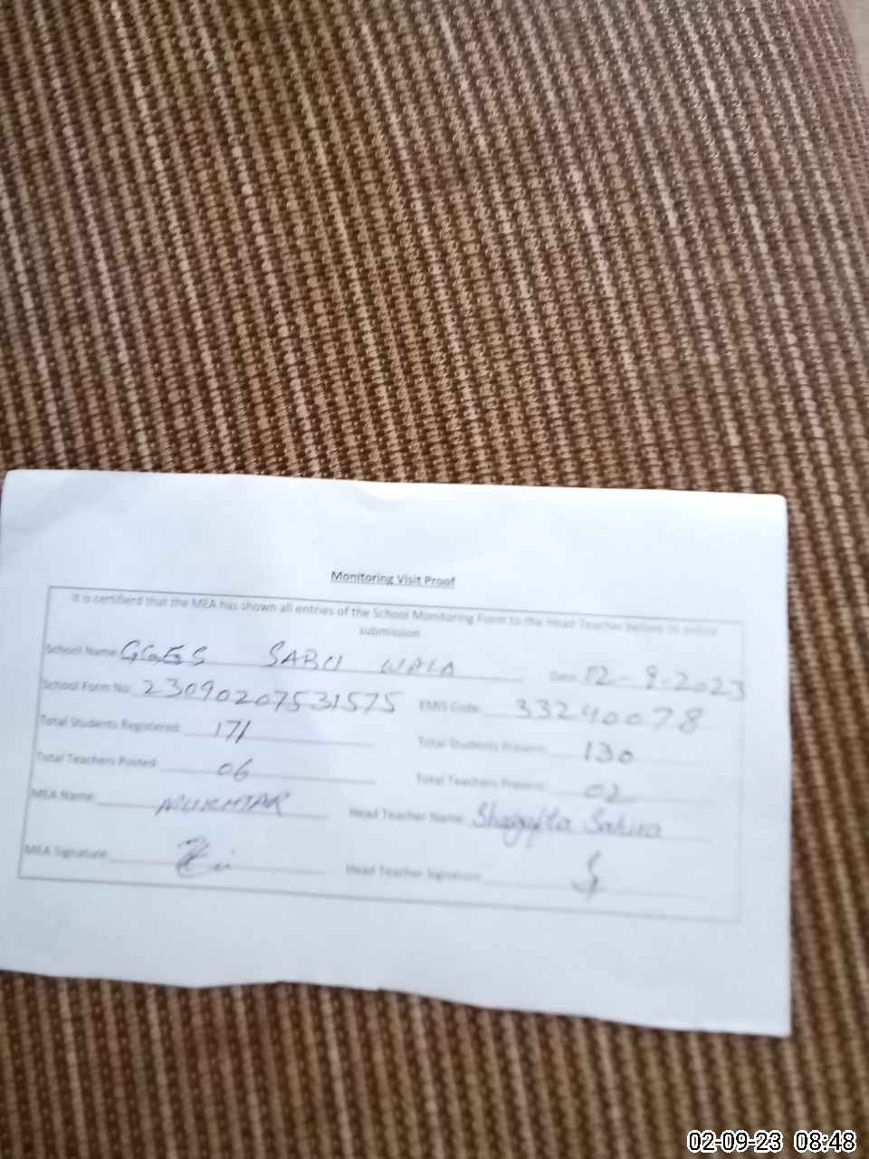 | Attendance Register | Head Teacher | MEA with School | Visit Proof |