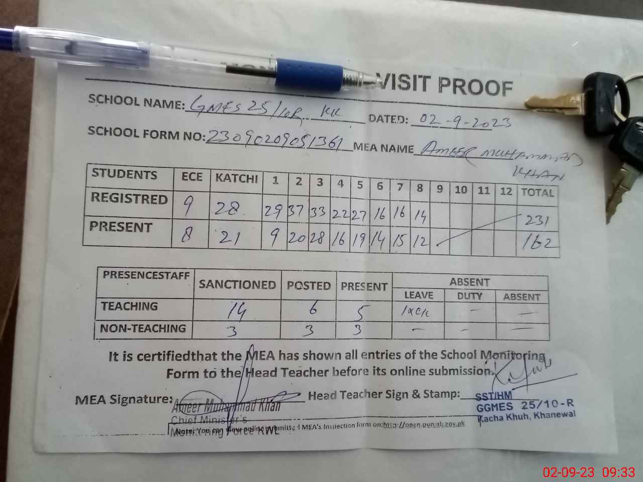 | Attendance Register | Head Teacher | MEA with School | Visit Proof |