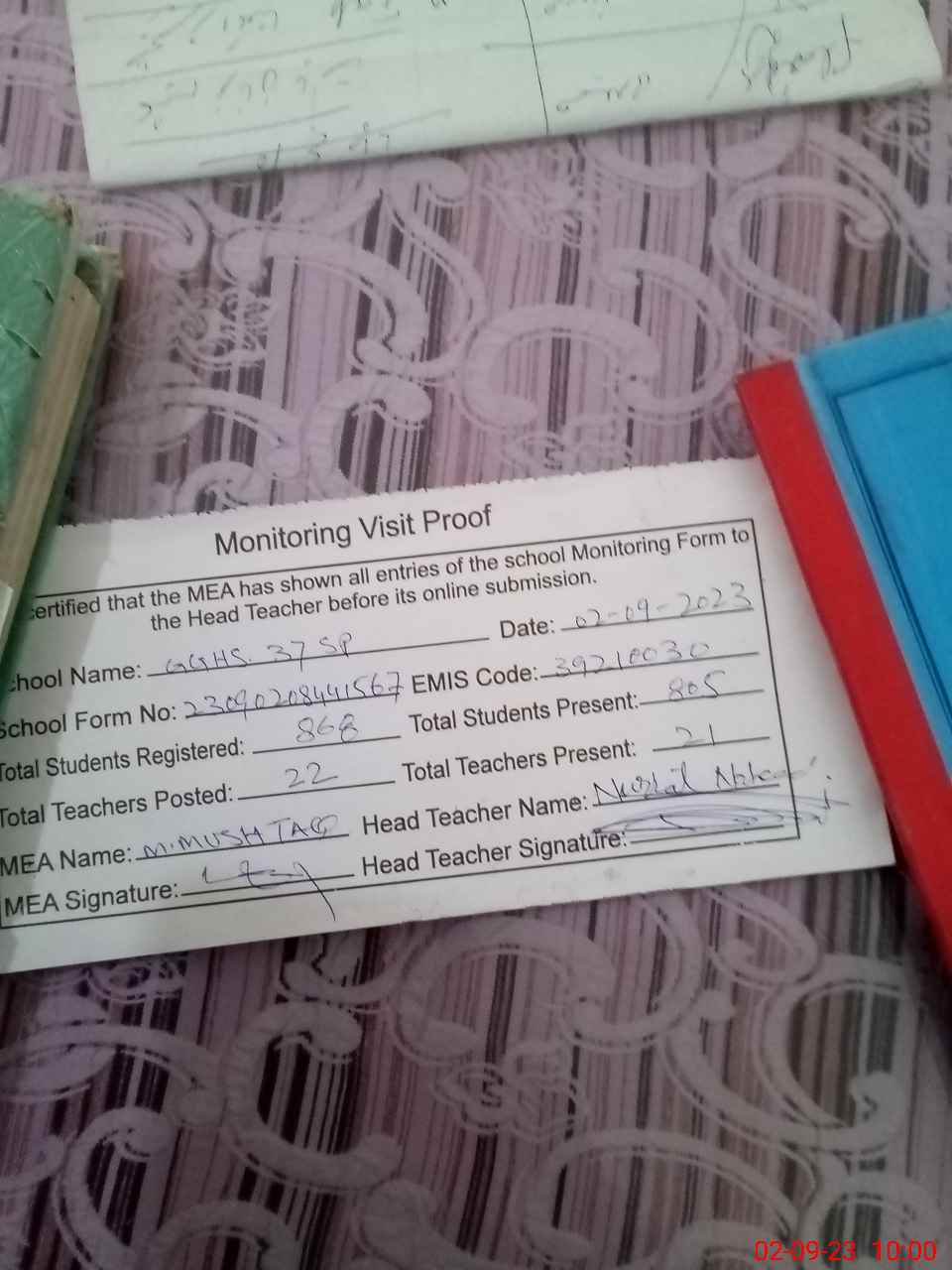 | Attendance Register | Head Teacher | MEA with School | Visit Proof |