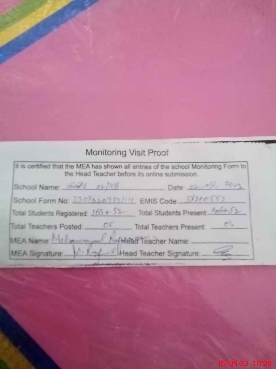 | Attendance Register | Head Teacher | MEA with School | Visit Proof |