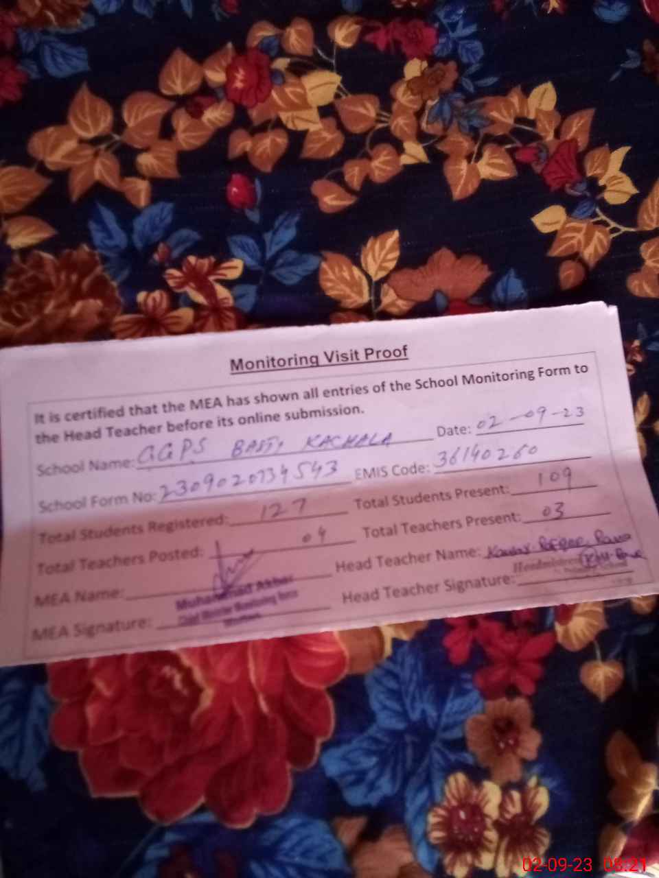 | Attendance Register | Head Teacher | MEA with School | Visit Proof |