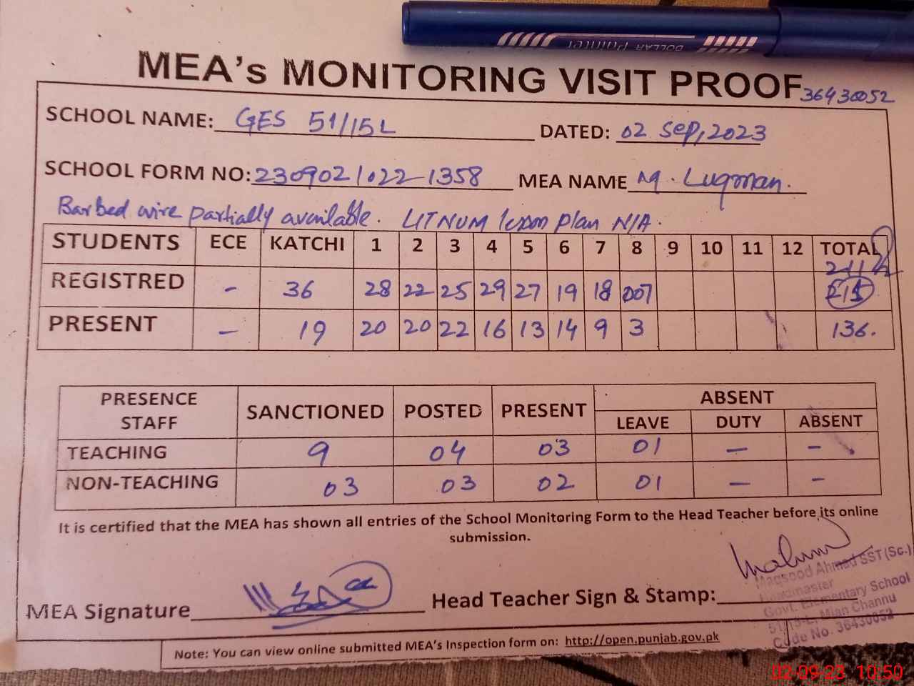 | Attendance Register | Head Teacher | MEA with School | Visit Proof |