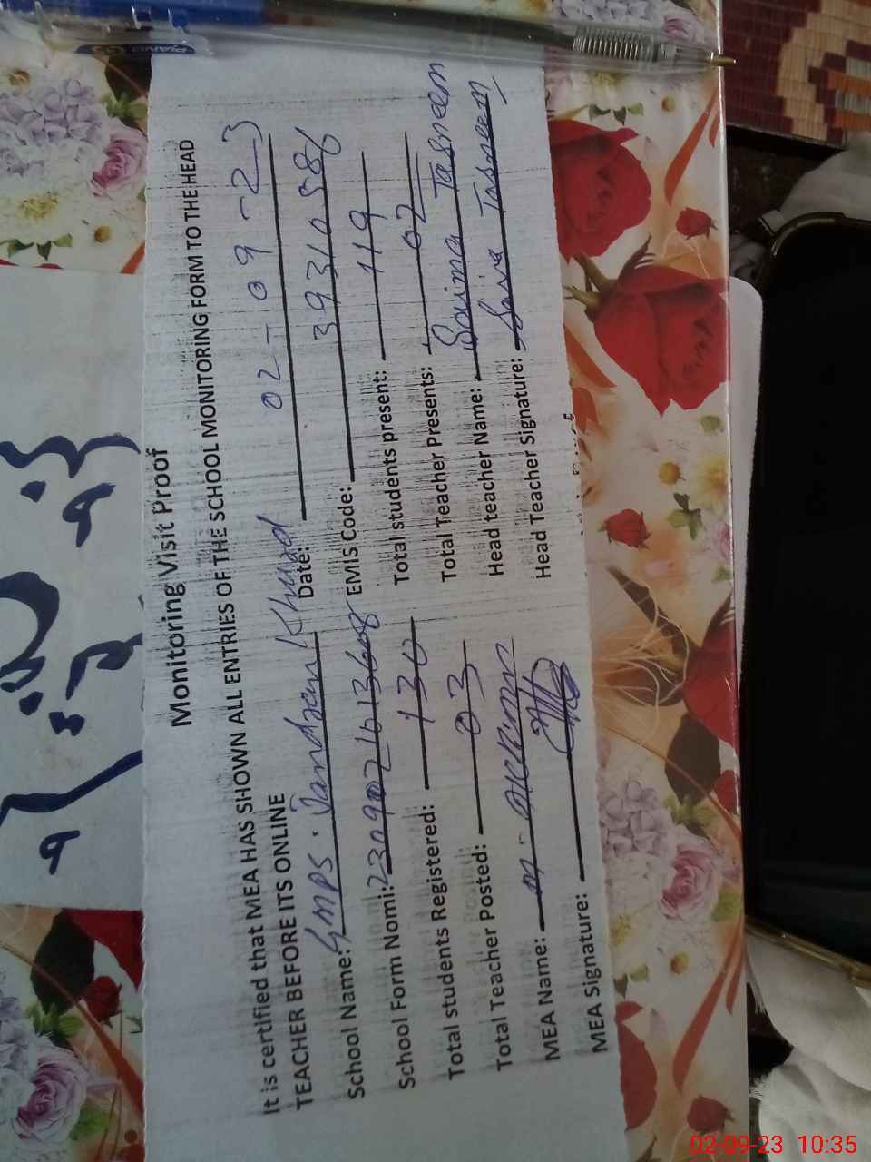 | Attendance Register | Head Teacher | MEA with School | Visit Proof |