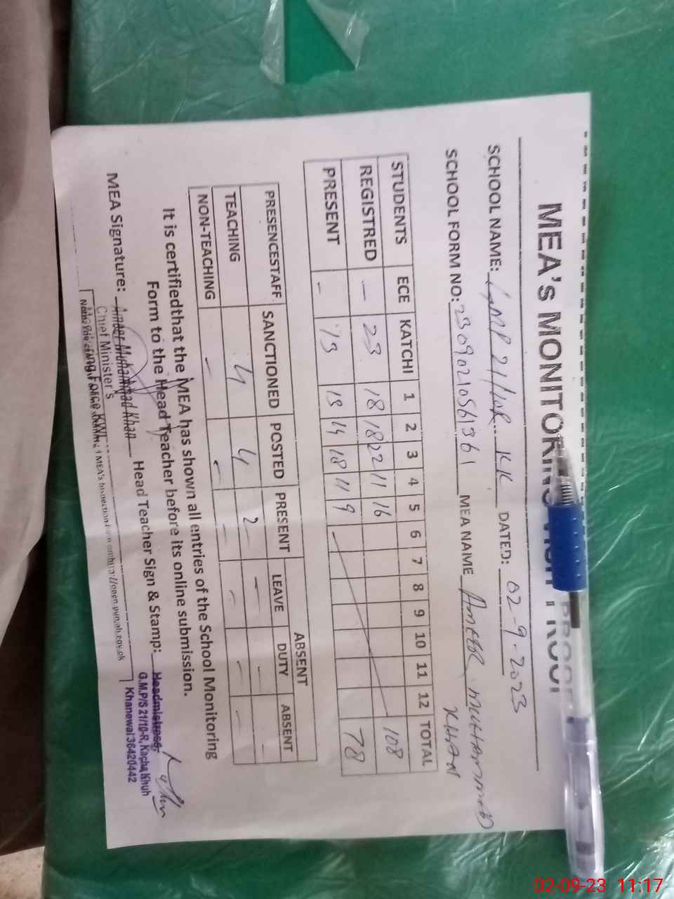 | Attendance Register | Head Teacher | MEA with School | Visit Proof |