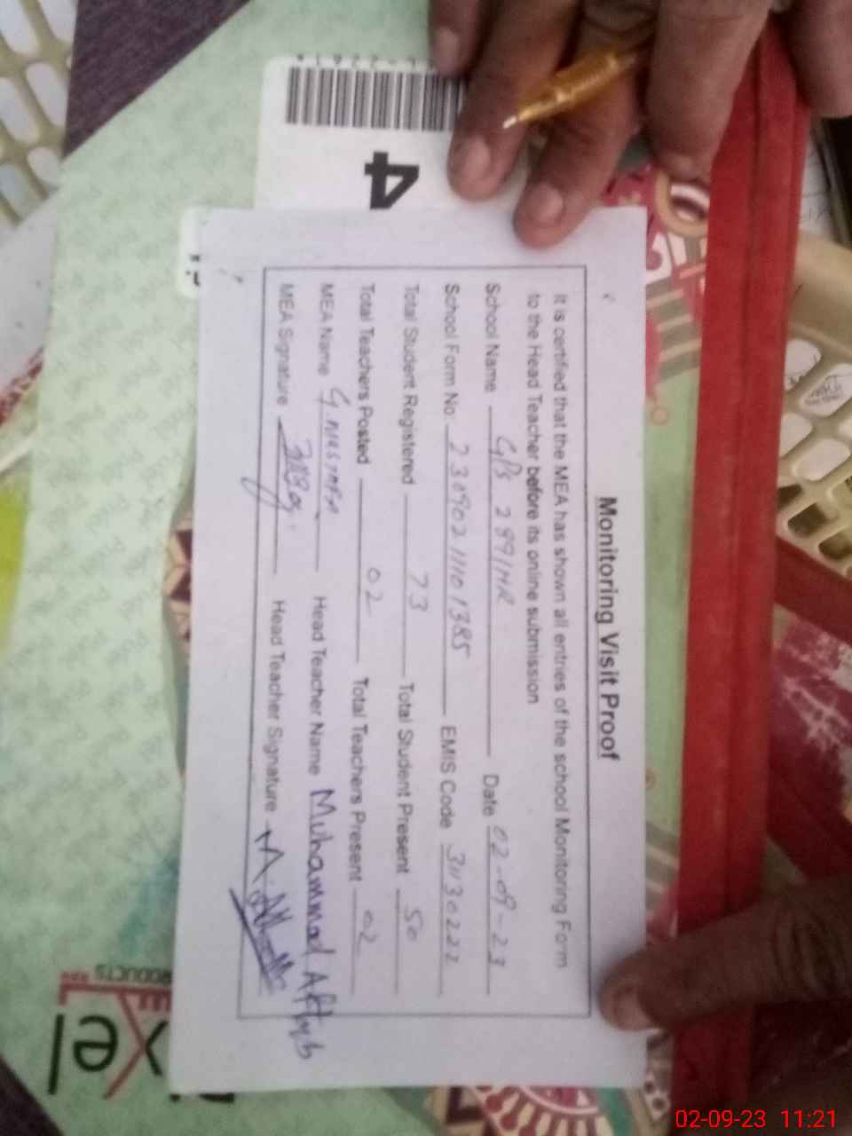 | Attendance Register | Head Teacher | MEA with School | Visit Proof |