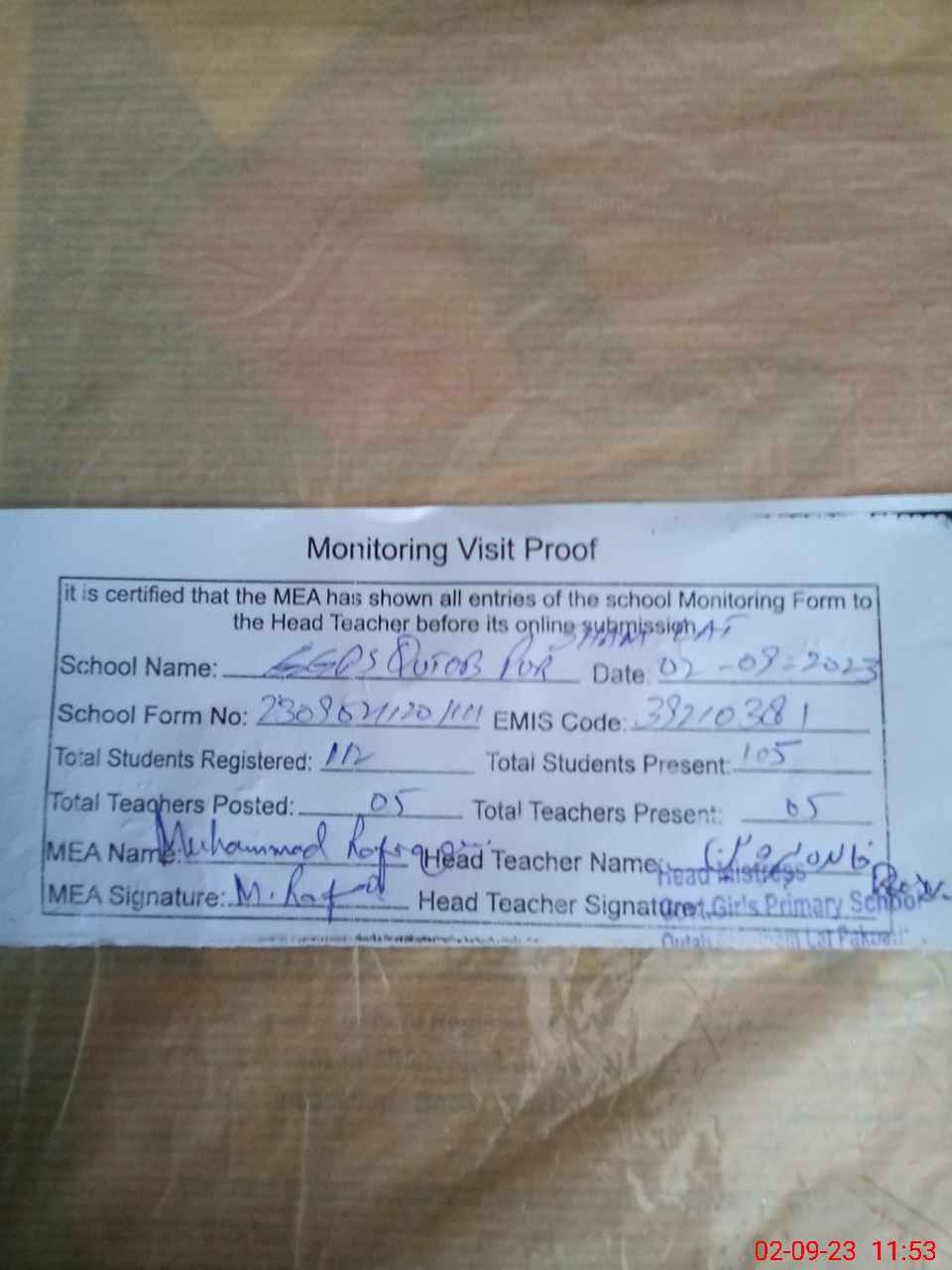 | Attendance Register | Head Teacher | MEA with School | Visit Proof |