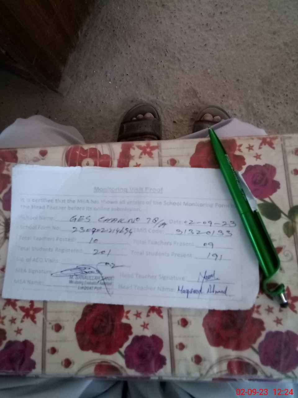 | Attendance Register | Head Teacher | MEA with School | Visit Proof |