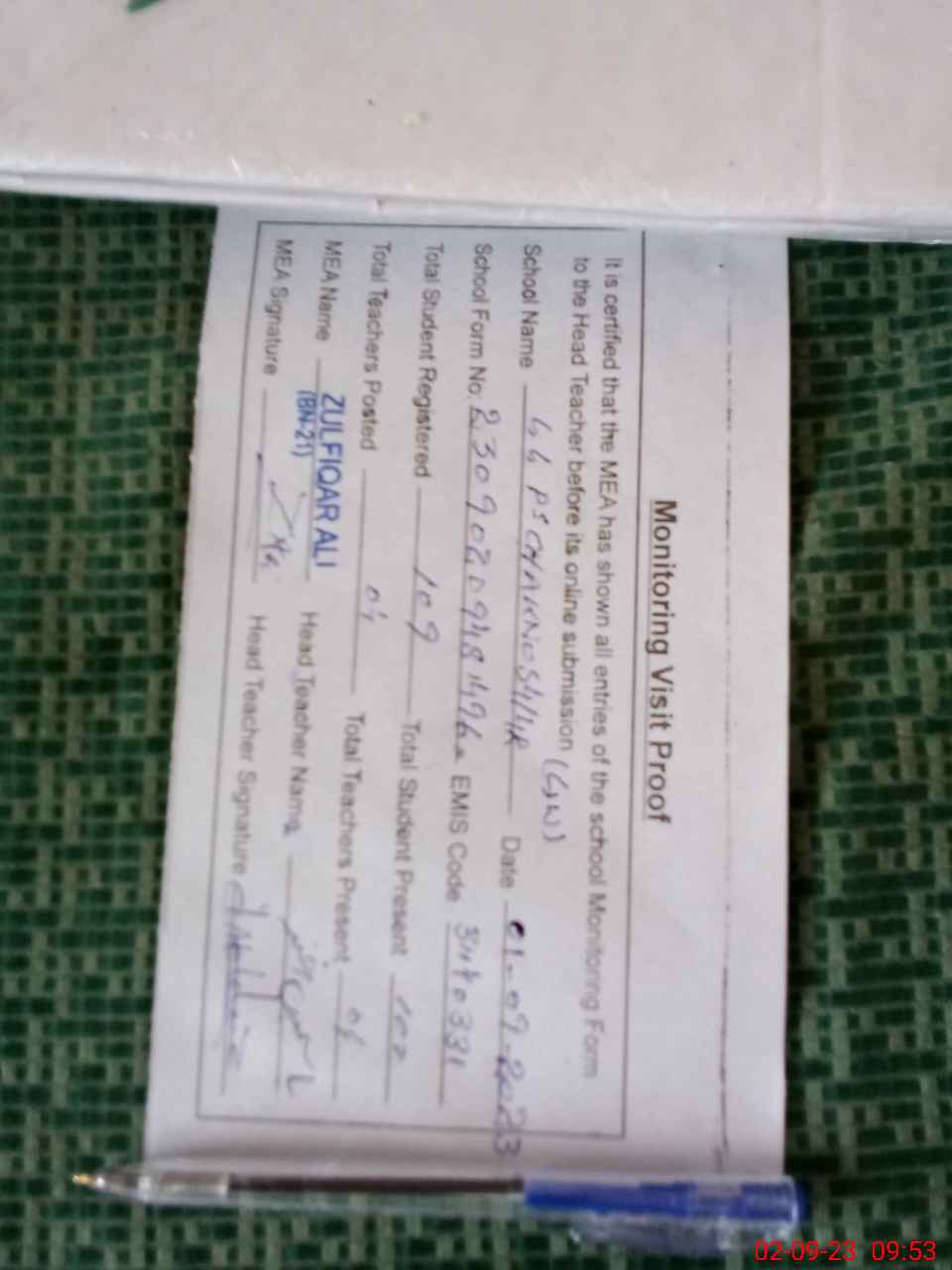 | Attendance Register | Head Teacher | MEA with School | Visit Proof |