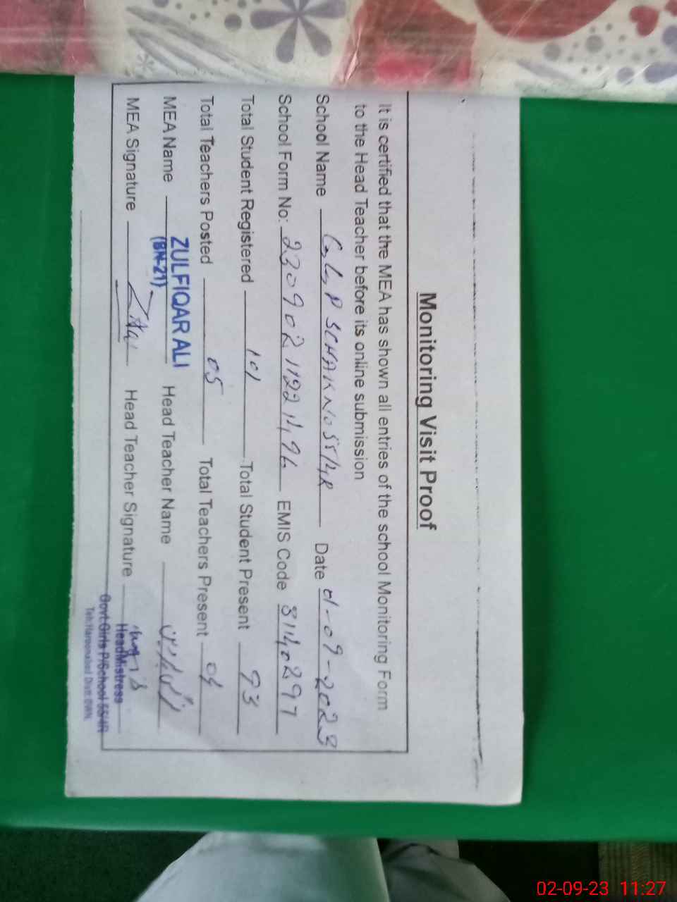 | Attendance Register | Head Teacher | MEA with School | Visit Proof |