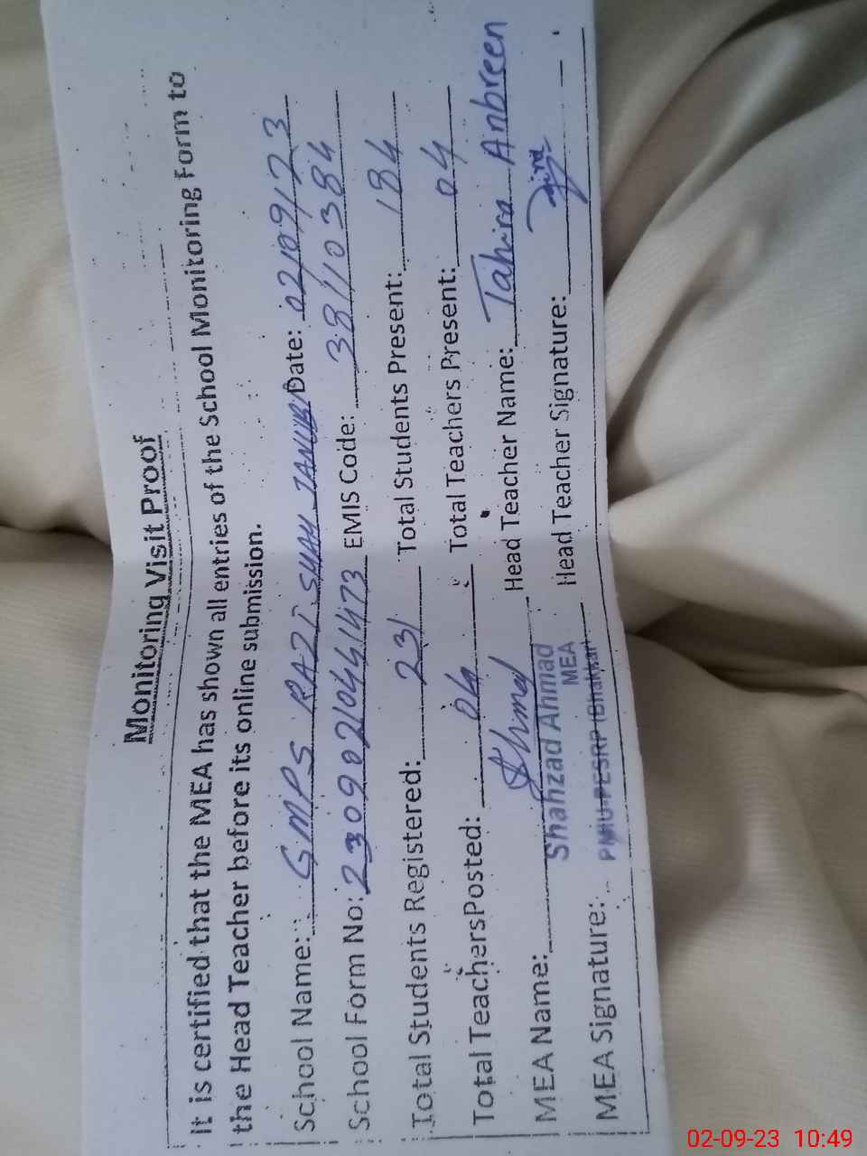 | Attendance Register | Head Teacher | MEA with School | Visit Proof |