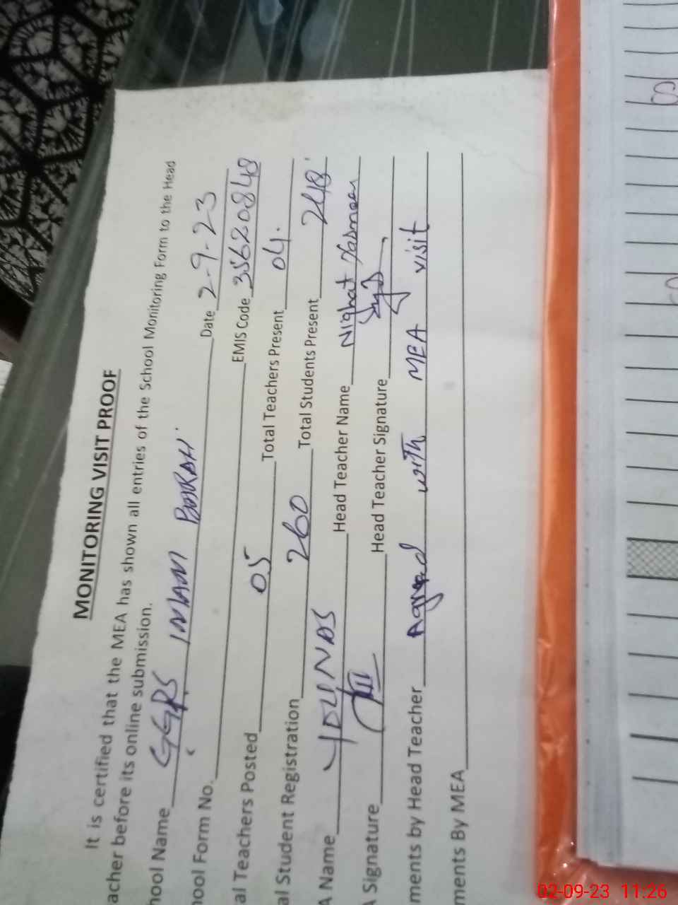 | Attendance Register | Head Teacher | MEA with School | Visit Proof |