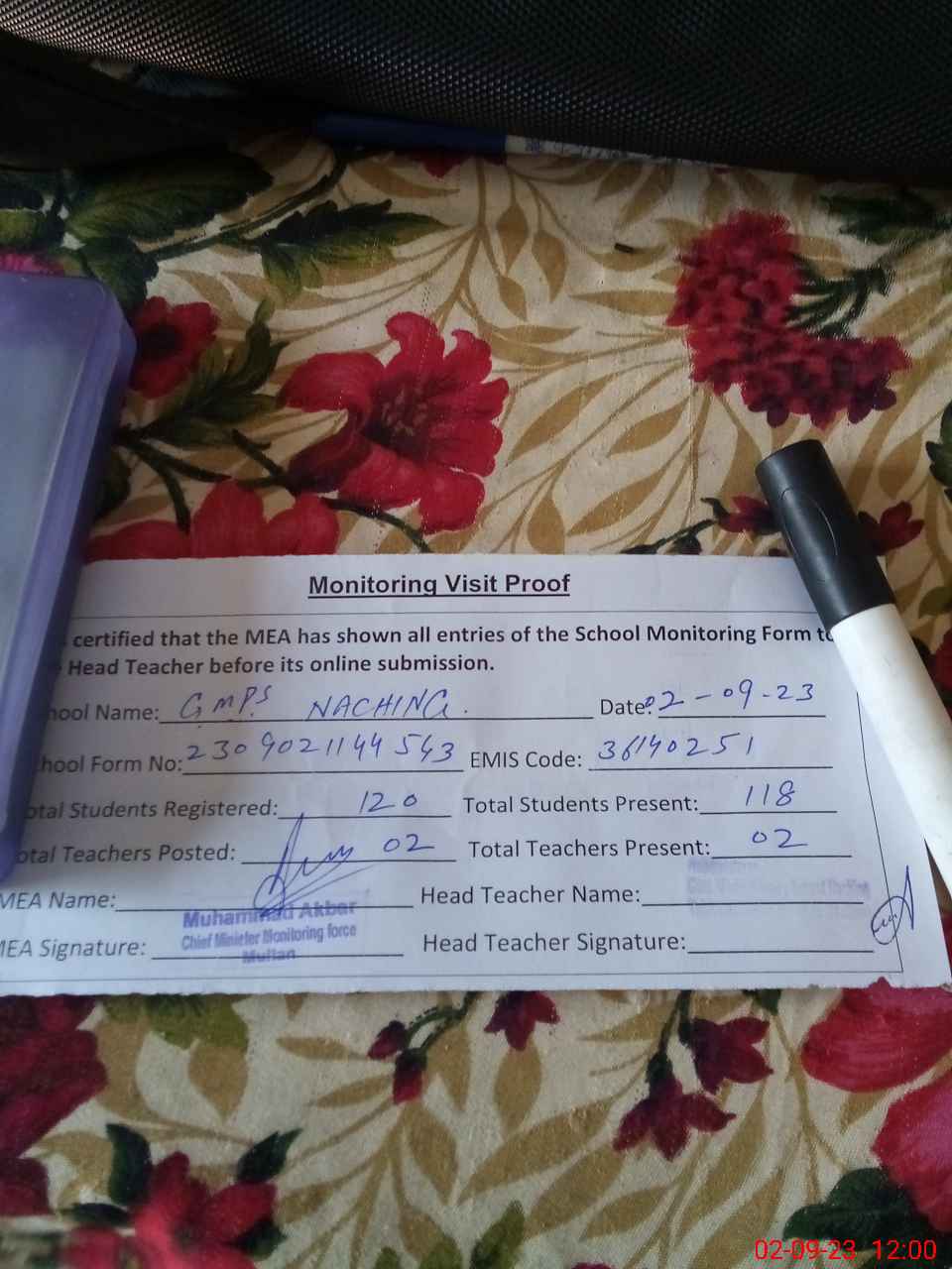 | Attendance Register | Head Teacher | MEA with School | Visit Proof |