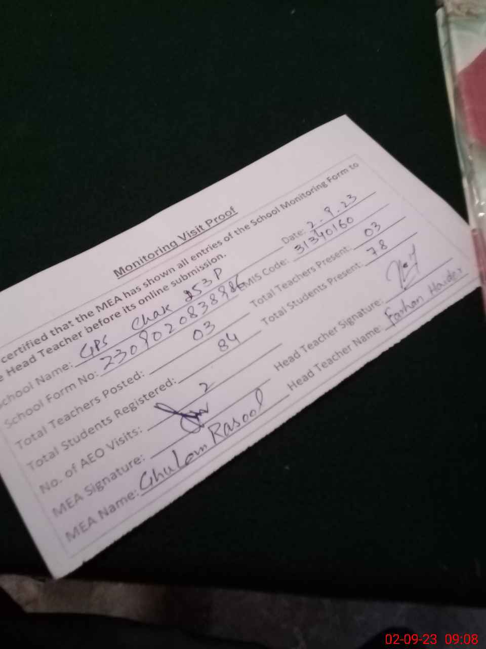 | Attendance Register | Head Teacher | MEA with School | Visit Proof |