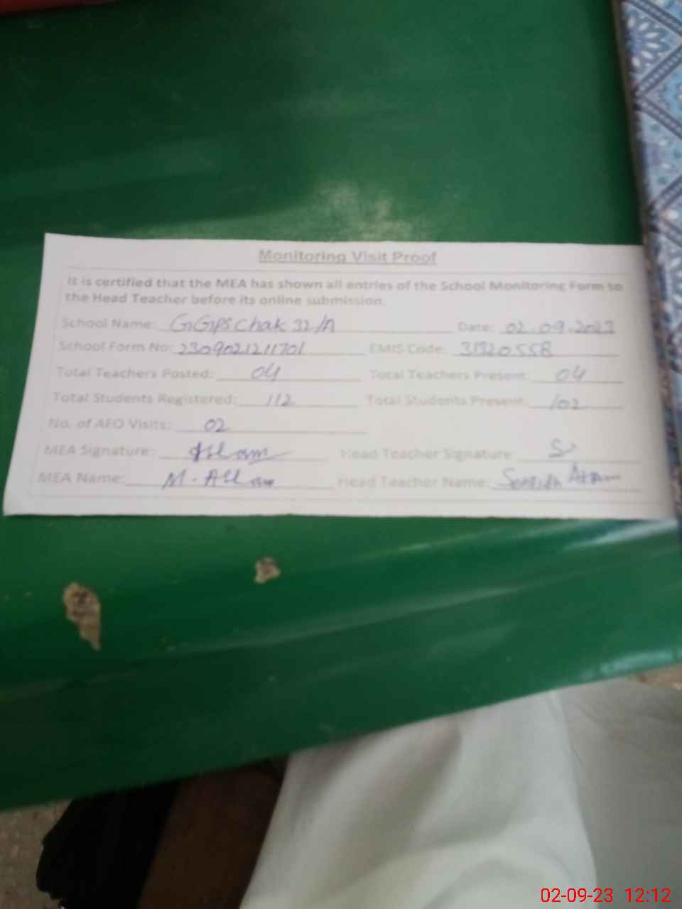 | Attendance Register | Head Teacher | MEA with School | Visit Proof |