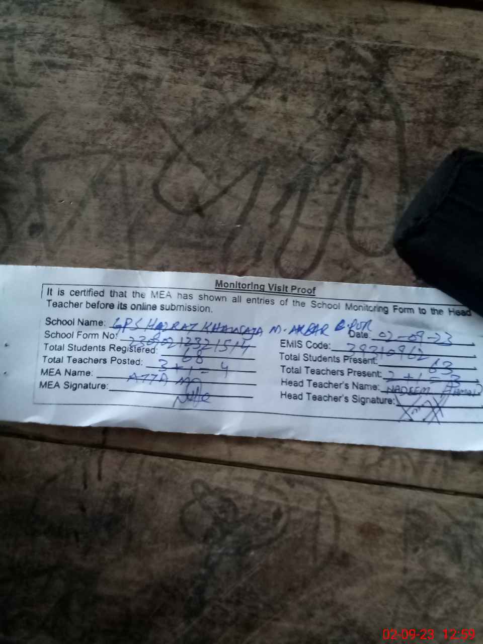 | Attendance Register | Head Teacher | MEA with School | Visit Proof |