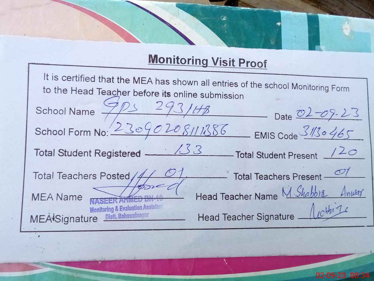 | Attendance Register | Head Teacher | MEA with School | Visit Proof |