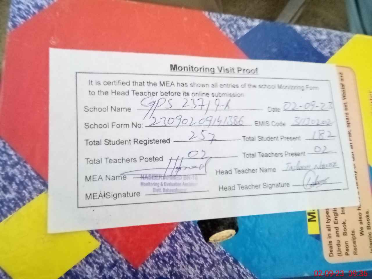 | Attendance Register | Head Teacher | MEA with School | Visit Proof |