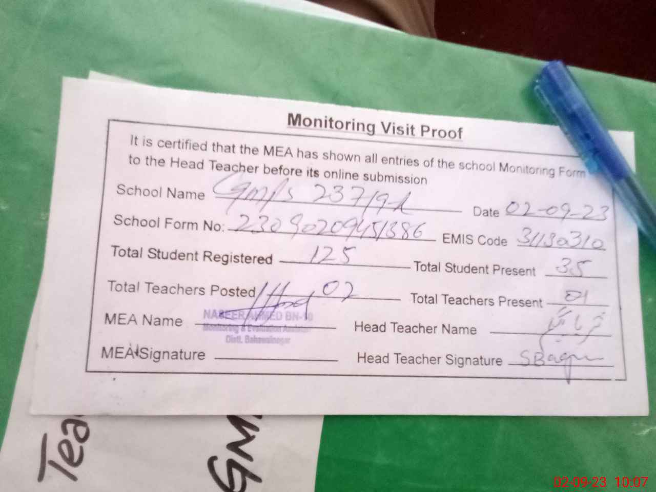 | Attendance Register | Head Teacher | MEA with School | Visit Proof |