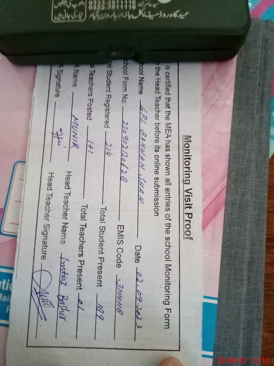 | Attendance Register | Head Teacher | MEA with School | Visit Proof |