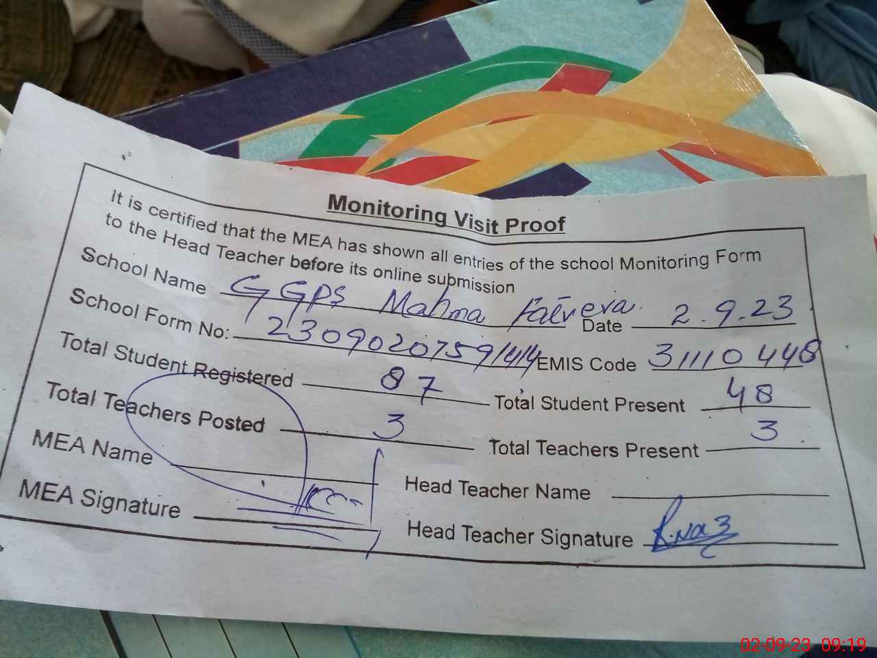 | Attendance Register | Head Teacher | MEA with School | Visit Proof |