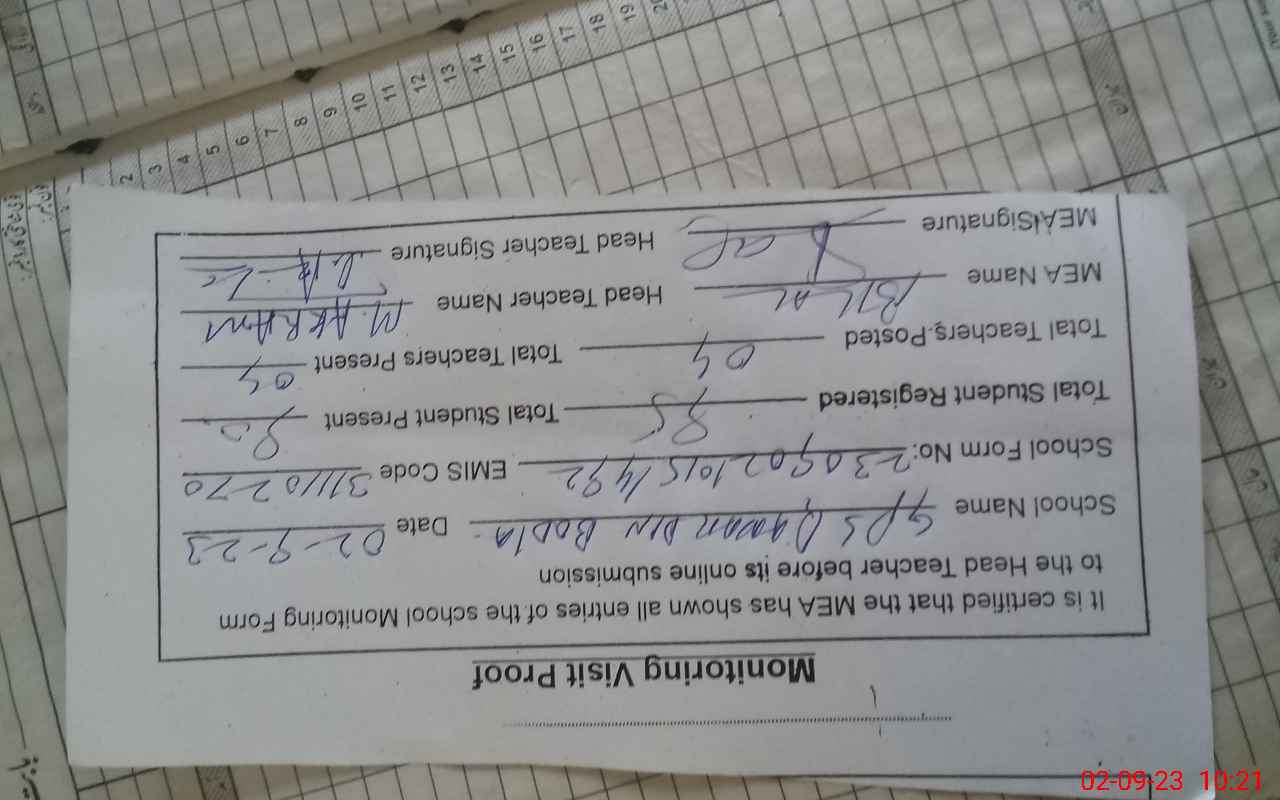 | Certified that this School was Inspected by the Undersigned MEA/DMO Today and the Information Stated Above is as Per Record. | |||||