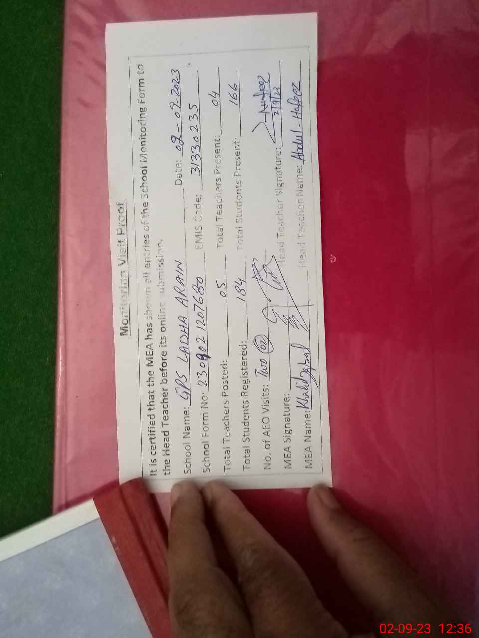 | Attendance Register | Head Teacher | MEA with School | Visit Proof |