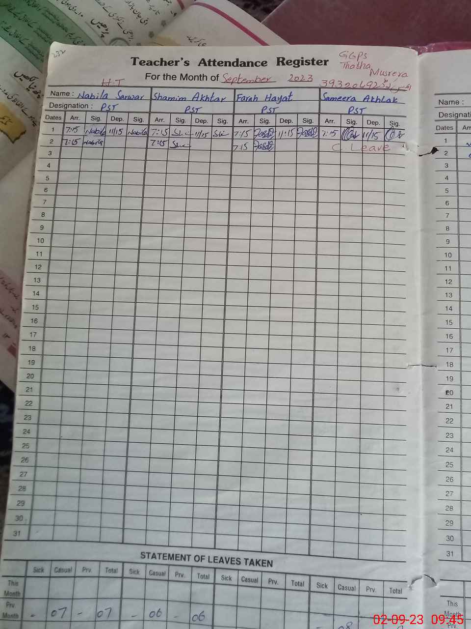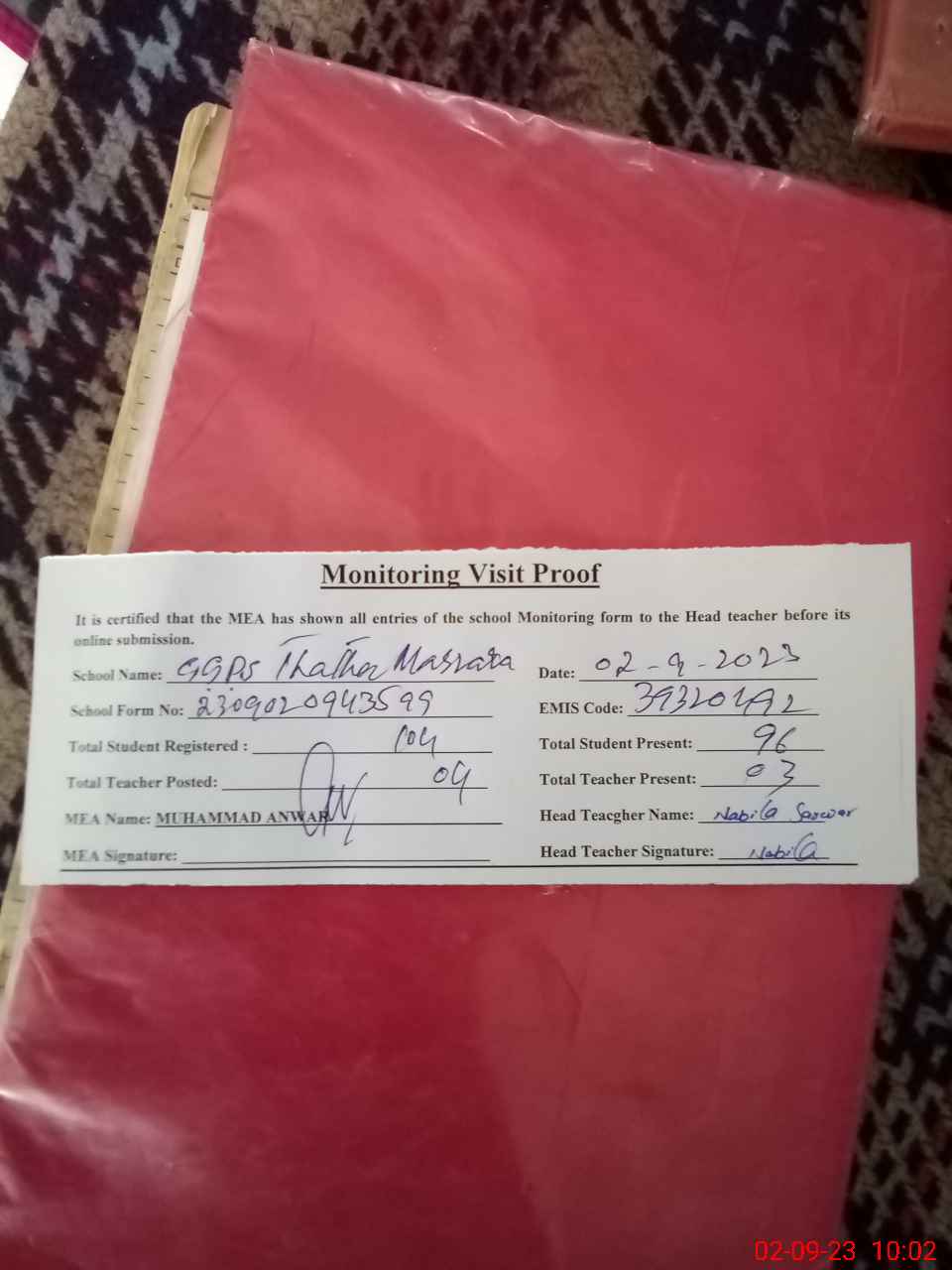 | Attendance Register | Head Teacher | MEA with School | Visit Proof |