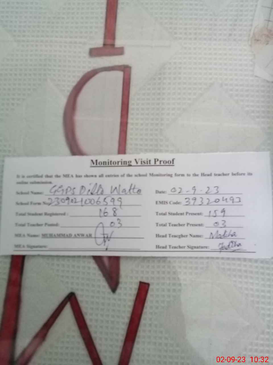 | Attendance Register | Head Teacher | MEA with School | Visit Proof |