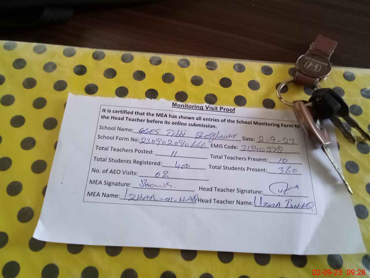 | Monitoring Date: 02-09-2023 | Start Time: 02-09-2023 08:46 AM | End Time: 02-09-2023 09:28 AM | Name of MEA: Mu**** Iz**** UlHa**** | |