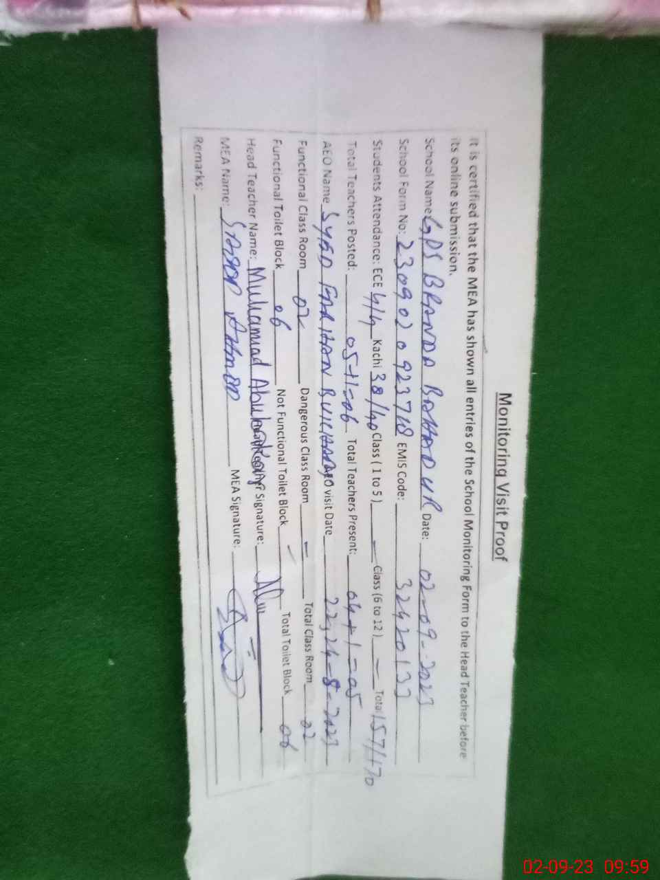 | Certified that this School was Inspected by the Undersigned MEA/DMO Today and the Information Stated Above is as Per Record. | |||||