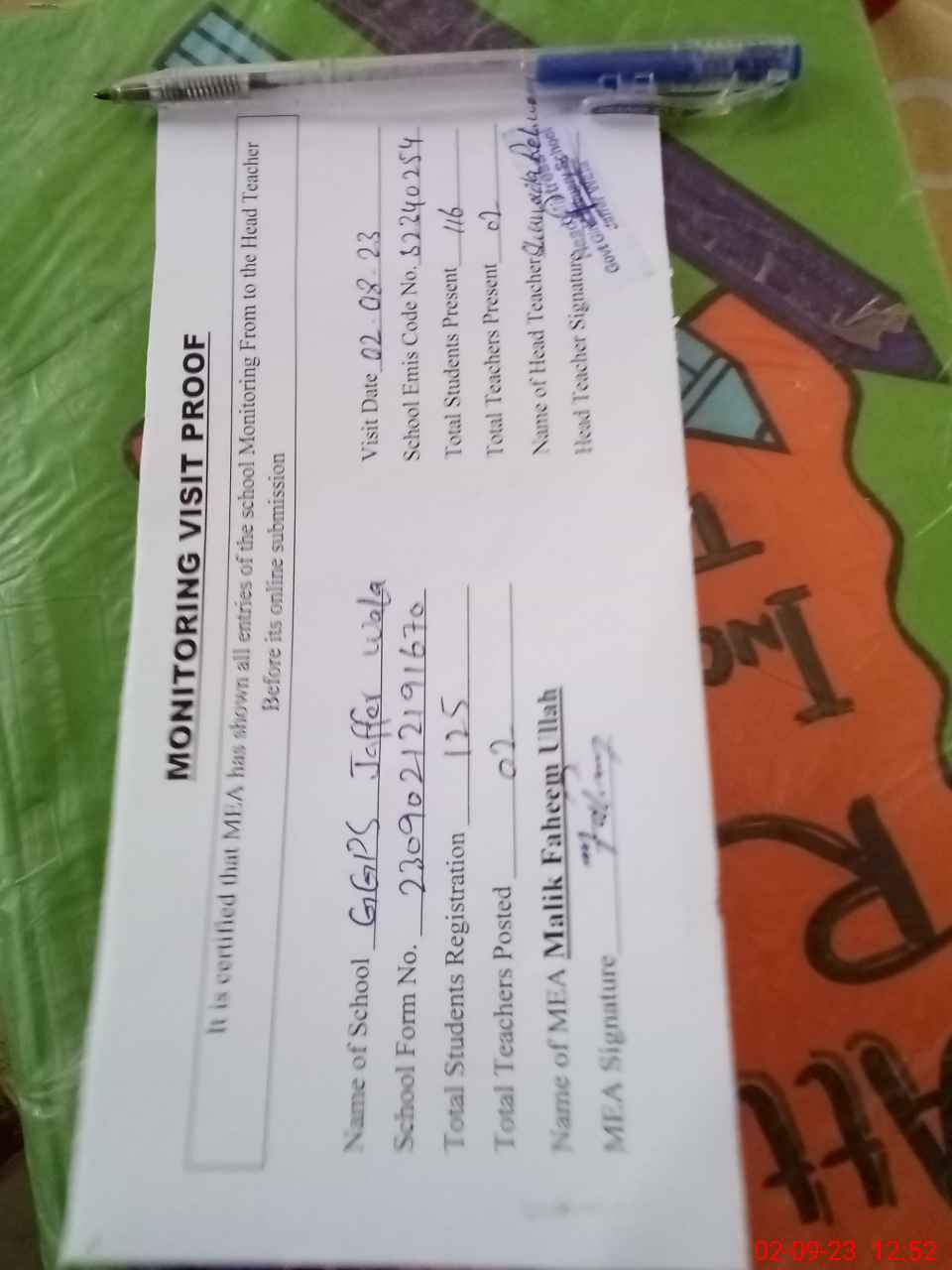| Attendance Register | Head Teacher | MEA with School | Visit Proof |