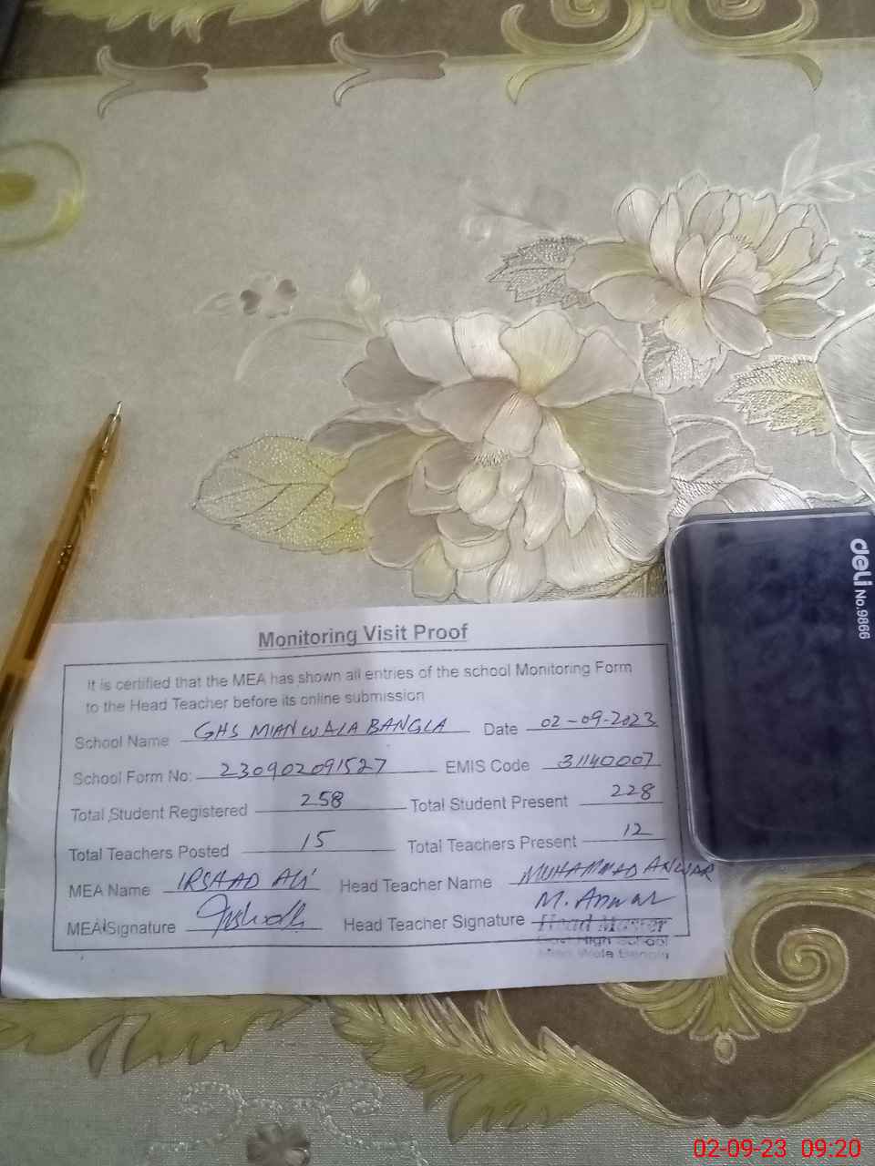 | Attendance Register | Head Teacher | MEA with School | Visit Proof |
